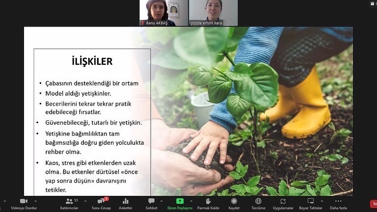 Çocuğun gelişimi için üstesinden gelebilecekleri ve hüsrana uğramayacakları deneyimleri oyunla sunmanın öneminden söz edilen oturumda ayrıca öz düzenlemenin desteklenebilmesi için farkındalık konusunda da model olabilecek deneyimleri sunan yetişkinlerin varlığının ne derece destekleyici olduğu vurgulandı.