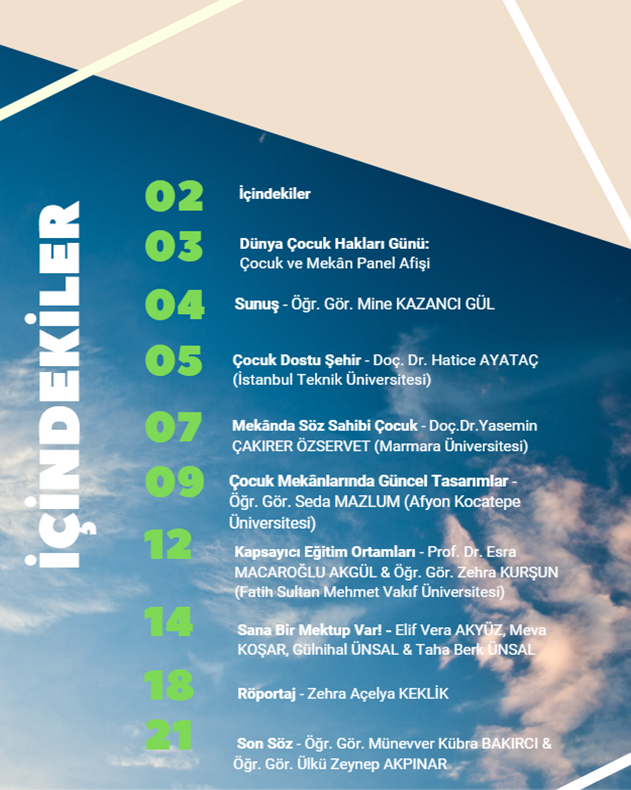 Rapor; Çocuk ve Mekân Paneli panelistleri Doç. Dr. Hatice AYATAÇ’ın “Çocuk Dostu Şehir”, Doç. Dr. Yasemin ÇAKIRER ÖZSERVET’in “Mekânda Söz Sahibi: Çocuk”, Öğr. Gör. Seda MAZLUM’un “Çocuk Mekânlarında Güncel Tasarımlar”, Prof. Dr. Esra AKGÜL ve Öğr. Gör. Zehra KURŞUN’un “Kapsayıcı Eğitim Ortamları” başlıklarındaki yazılarını içermektedir. Ayrıca raporda, “Nasıl bir dünyada yaşamak isterdin?” sorusuna yanıt olarak çocukların çizdiği resimlere yer verilmiştir. Bir çocukla yapılan “Çocuk ve Mekân” temalı röportaj da istifadenize sunulmuştur.