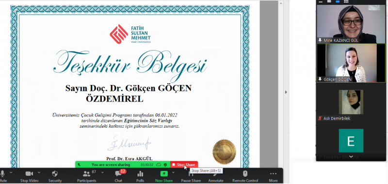 Fatih Sultan Mehmet Vakıf Üniversitesi Meslek Yüksekokulu Çocuk Gelişimi Programı tarafından düzenlenen “Eğitimcinin Söz Varlığı” semineri 06 Ocak 2022 tarihinde Zoom Meeting üzerinden gerçekleştirildi.