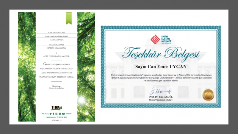 Erken Çocukluk Döneminde Ritim ve Söz Eşliği Uygulamaları semineri Can Emre UYGAN’a teşekkür belgesi ve TEMA Vakfı aracılığı ile Elazığ Karaali Hatıra Ormanı’nda dikilen fidan dikim sertifikalarının takdimi ile sonlandırıldı.