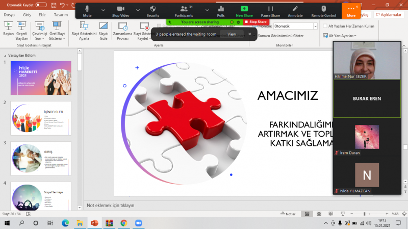 Fatih Sultan Mehmet Vakıf Üniversitesi Meslek Yüksekokulu Çocuk Gelişimi Programı tarafından düzenlenen "İyilik Hareketi 2021" adlı seminer 15 Ocak 2021 tarihinde Zoom Meeting uygulaması üzerinden gerçekleştirildi.