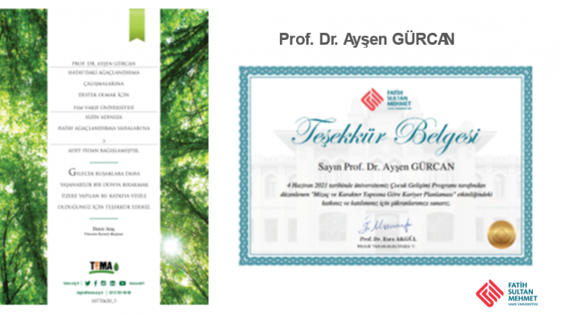 Etkileşimli bir ortamda geçen etkinlik Öğr. Gör. Halime Nur SEZER’in konuşmacımız Prof. Dr. Ayşen GÜRCAN’a teşekkür belgesi ile TEMA fidan bağış sertifikası takdim etmesi ve katılımcıların teşekkürleriyle sona erdi.