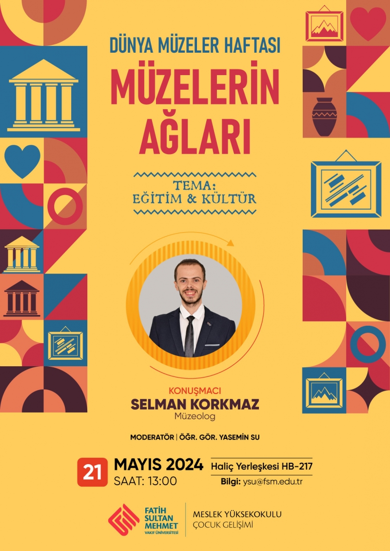 Fatih Sultan Mehmet Vakıf Üniversitesi Meslek Yüksek Okulu Çocuk Gelişimi programı, Dünya Müzeler Haftası: ‘Müzelerin Ağları / Eğitim & Kültür’ isimli seminer 21.05.2024 tarihinde Öğr. Gör. Yasemin SU moderatörlüğünde gerçekleştirildi.