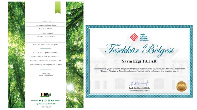 Yaratıcı Hareket ve Dans Uygulamaları Atölyesi sonunda Ezgi TATAR’a teşekkür belgesi ve TEMA Vakfı aracılığı ile Elazığ Karaali Hatıra Ormanı’nda dikilen fidan dikim sertifikalarının takdimi ile sonlandırıldı.