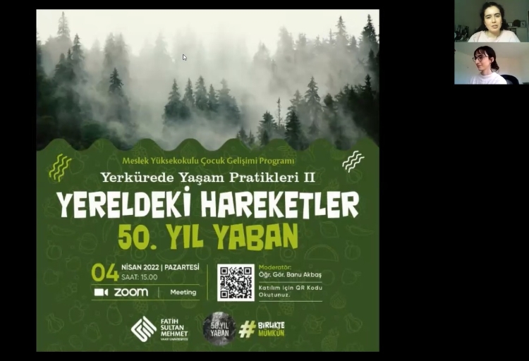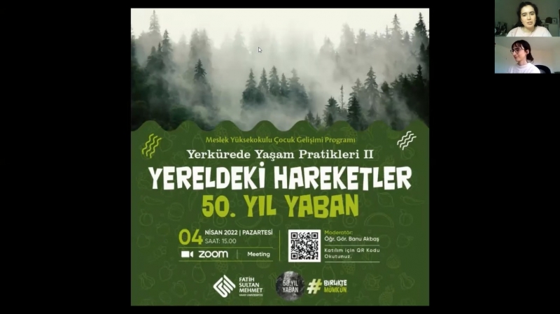 Fatih Sultan Mehmet Vakıf Üniversitesi Meslek Yüksekokulu Çocuk Gelişimi Programı tarafından düzenlenen Yerkürede Yaşam Pratikleri serisinin ikinci buluşması 04 Nisan 2022 tarihinde Öğr. Gör. Banu Akbaş moderatörlüğünde 50.Yıl Yaban Korusu savunucularından Dila Türkmen’i konu etti.